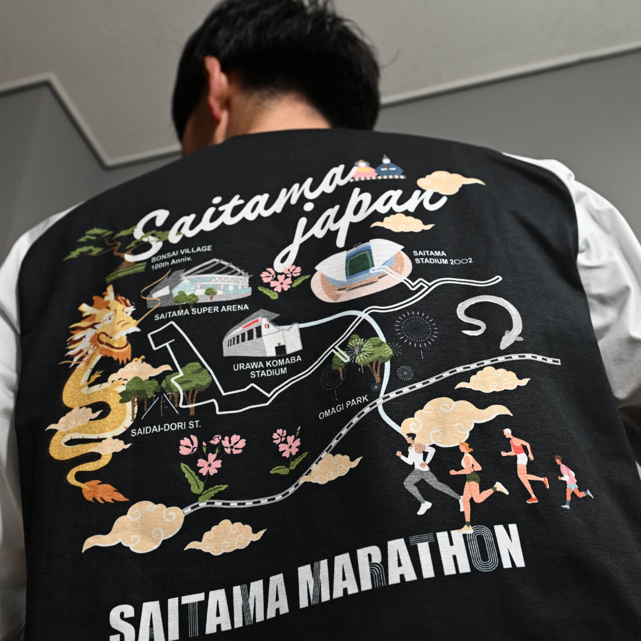 ユニークなデザインとその歴史的背景から再評価されファッション愛好家からの支持も高いスカジャンをさいたまマラソン風にアレンジ。コース周りにある代表的な建造物などをレイアウトしユーモラスに仕上げました。